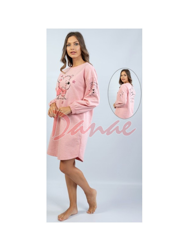 Dámská noční košile, ze zateplené bavlny, s okrouhlým výstřihem, dlouhý rukáv je zakončený gumkou v tunelu.