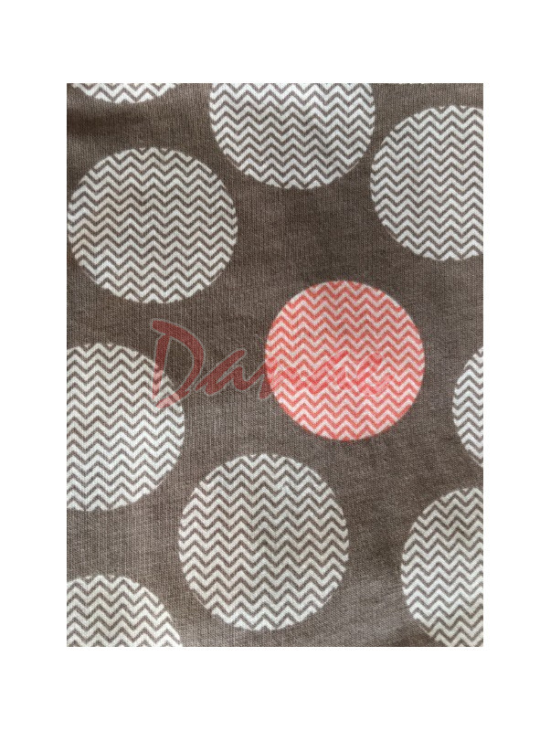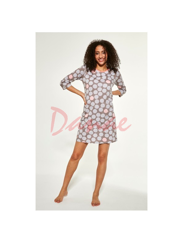 Dámská vzorovaná noční košile - Judie. Dámská noční košile, s tříčtvrtečním rukávem. Okrouhlý výstřih, je s barevnou lemovkou. Délka do půl stehen. Vzor - velké puntíky, dvou barev, detail vzoru je na posledním obrázku.