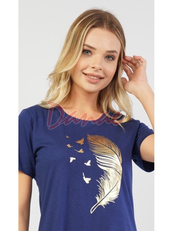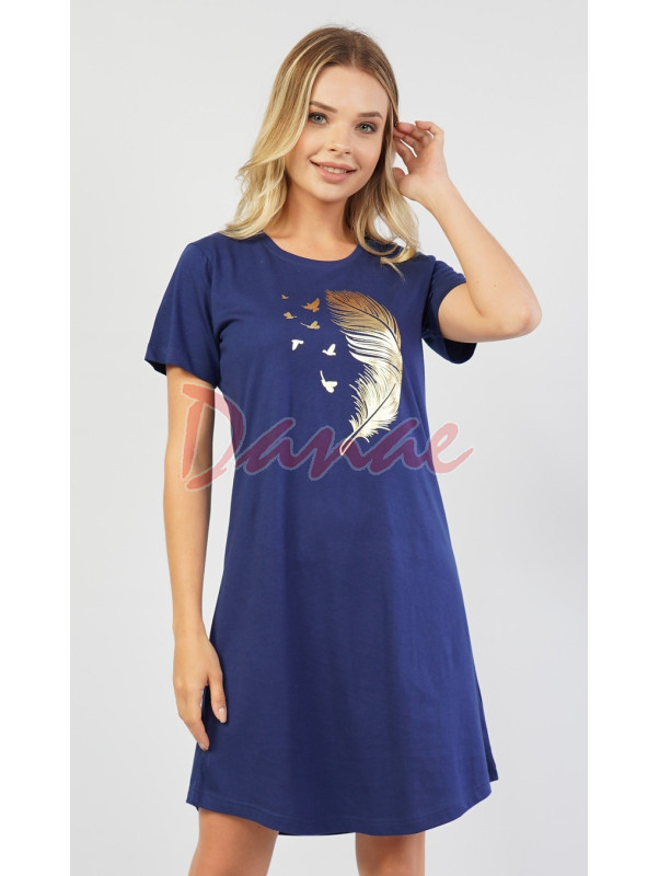 Dámská noční košile s metalickým potiskem Pírko. Dámská noční košile, s krátkým rukávem, okrouhlý výstřih, má na přední straně velký potisk - zlaté pírko, s letícími ptáky v pozadí. Velikosti až do 4XL.