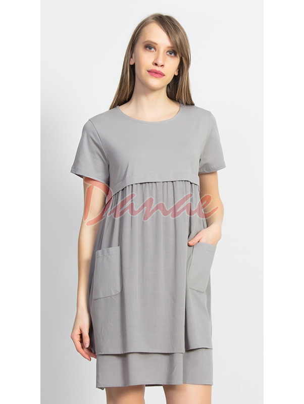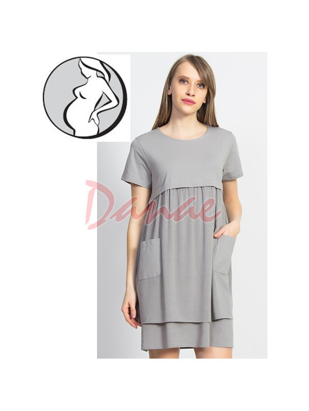 Pohodlná volná dámská noční košile, vhodná pro období těhotenství, pod prsy rozšířená - volnější na bříšku, přizpůsobí se rostoucímu bříšku. Dvě velké kapsy, na drobnosti. Nemá otvory ke kojení.