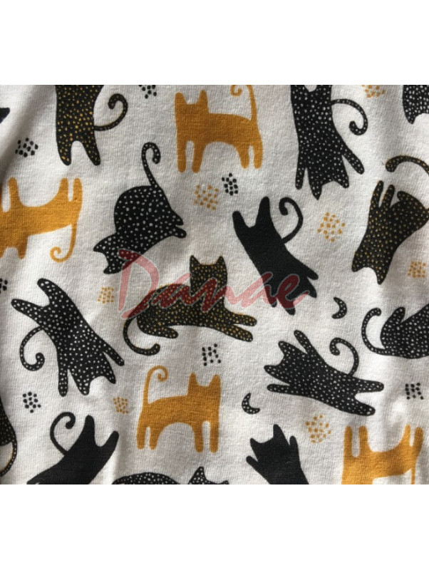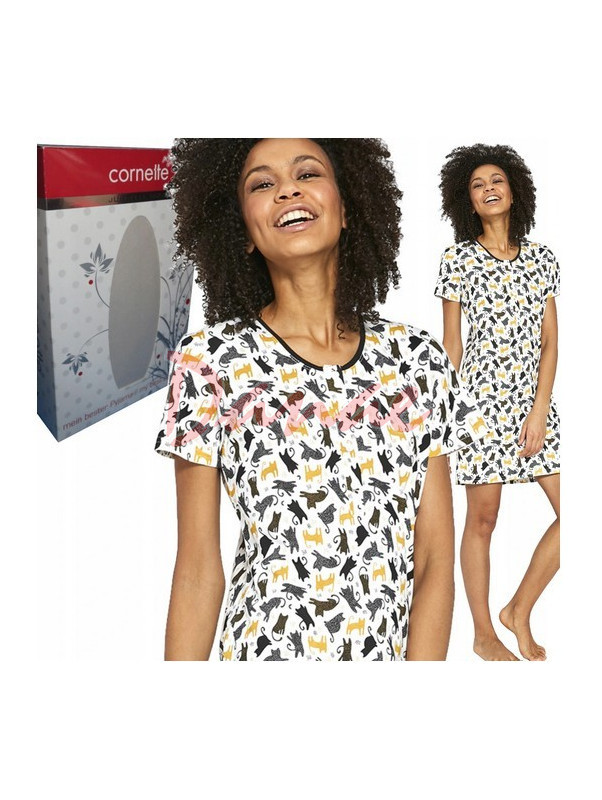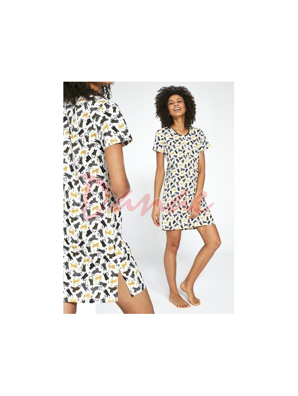 Pohodlná dámská noční košile, s krátkým rukávem, výstřih pokračuje légou na rozepínání, na knoflíčky. Košile je celovzorována motivem kočky. Délka nad kolena, na spodu - po stranách jsou rozparky.
