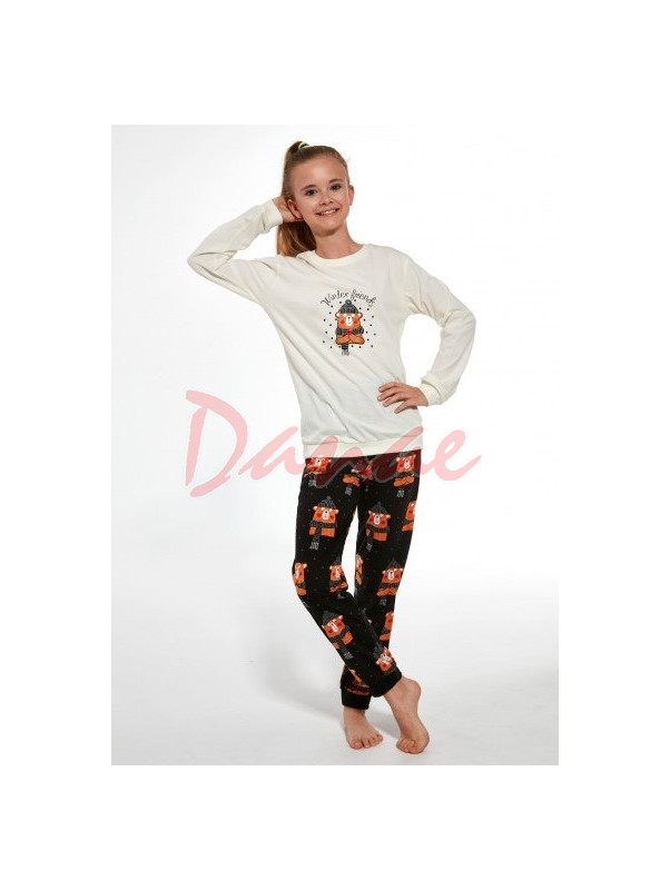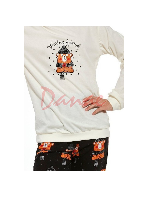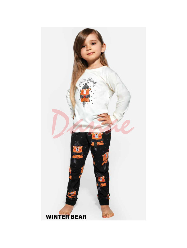 Světlé tričko, s dlouhým rukávem, je na přední straně zdobeno potiskem s medvídkem, nápis: Winter friends. Kalhoty jsou dlouhé, celovzorované medvídky.