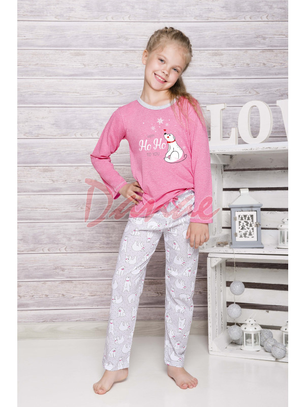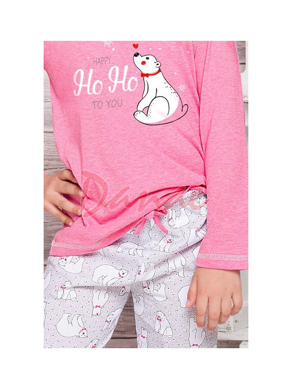 Jednobarevné růžové tričko, na přední straně s potiskem: Bílý medvěd, s mašličkou u krku, nápis: Happy Ho Ho to you.