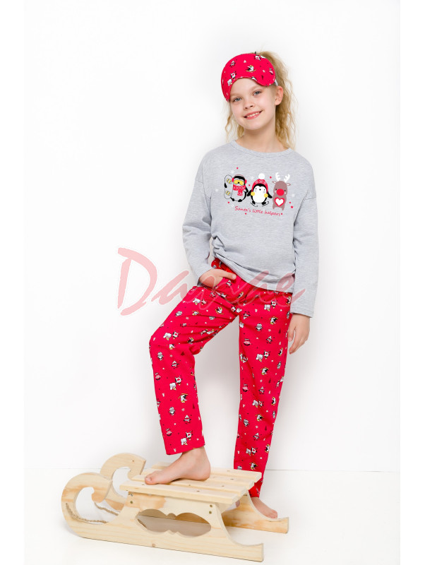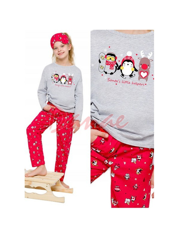 Jednobarevné tričko, s dlouhým rukávem a okrouhlým výstřihem, je na přední straně zdobeno potiskem: tučňáci a sob, nápis: Santa´s little helpers.