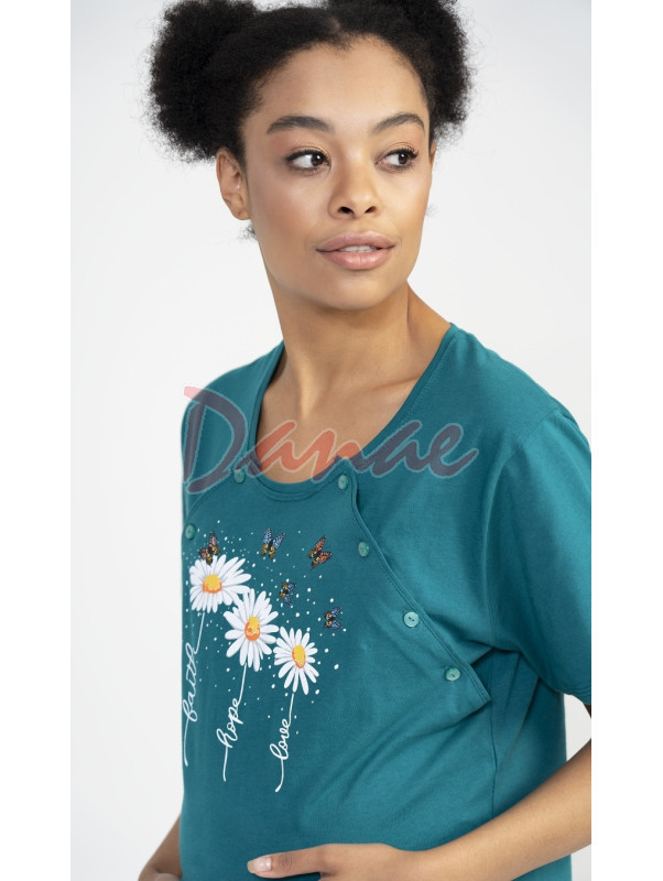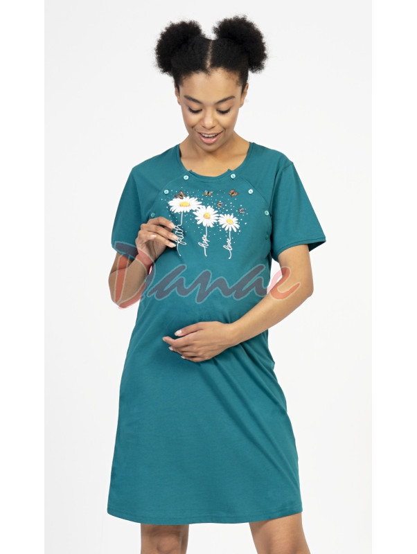 Noční košile pro nastávající i kojící maminky - okrouhlý výstřih, krátké rukávy, oboustranné rozepínání na knoflíky.