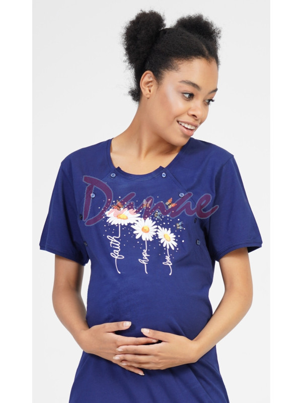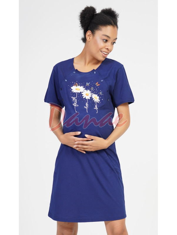 Noční košile pro nastávající i kojící maminky - okrouhlý výstřih, krátké rukávy, oboustranné rozepínání na knoflíky.