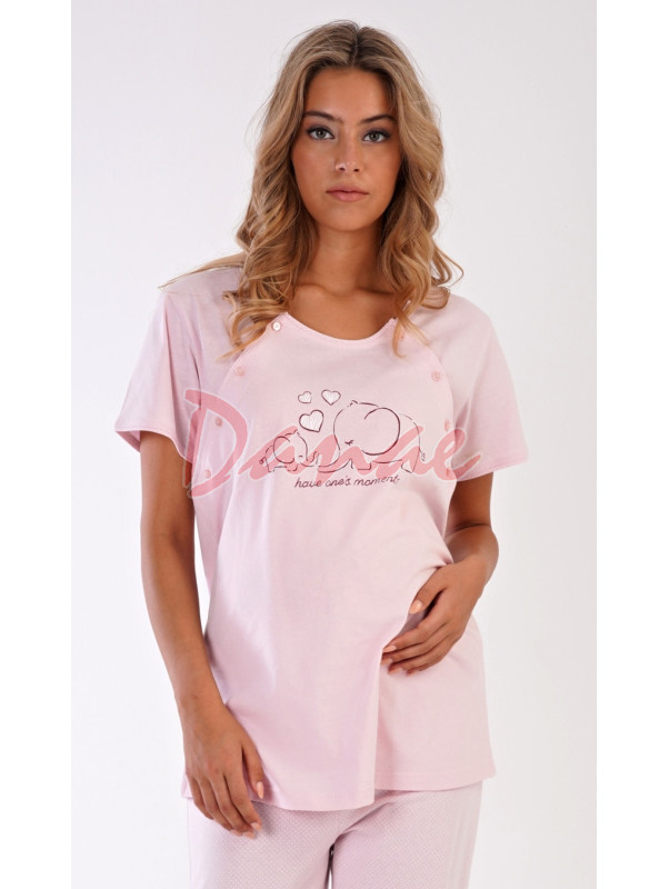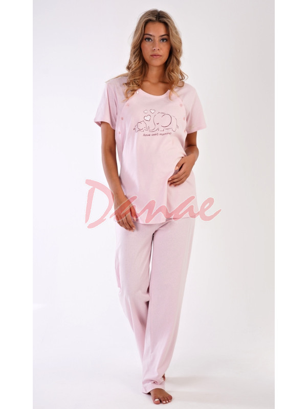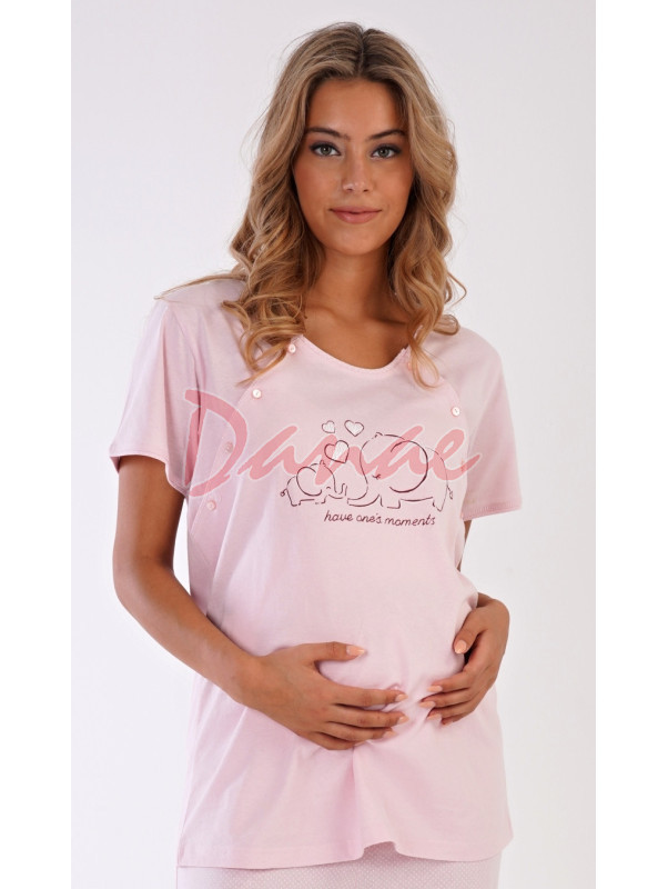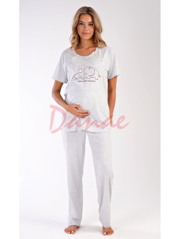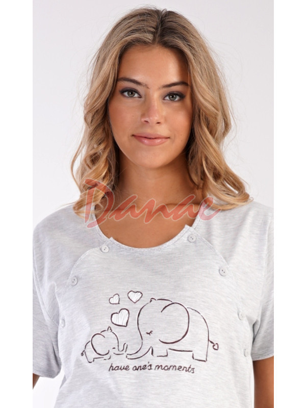 Mateřské pyžamo se sloníky - pohodlné tričko, s krátkým rukávem, je na přední straně s obrázkem sloníků - máma a malé slůně a nápis: Have one´s moments. Oboustranné rozepínání - pro pohodlné kojení. Kalhoty jsou dlouhé, mají v pase gumu i šňůrku ke stažení.