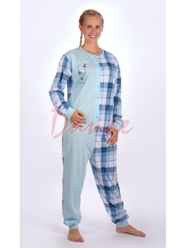 Venku je zima - dámský károvaný overal na spaní, s potiskem na jednobarevné části: medvídek v čepičce a se šálou, se stříbrným detailem, nápis: Baby it´s Cold Outside. Rukávy i spodek kalhot jsou zakončeny patentem.