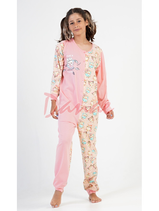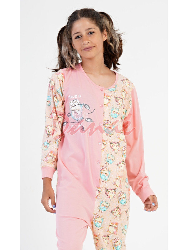 Overal se zapíná na knoflíky, rukávy, i spodek kalhot, jsou zakončeny pružným patentem. Na jednobarevné části, odpočíva sovička na větvi, nápis: Have a nice day.