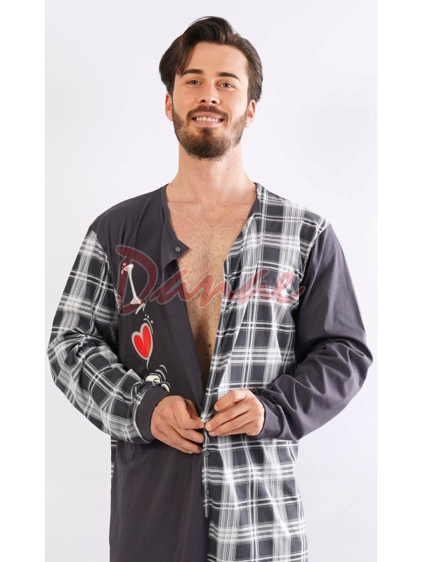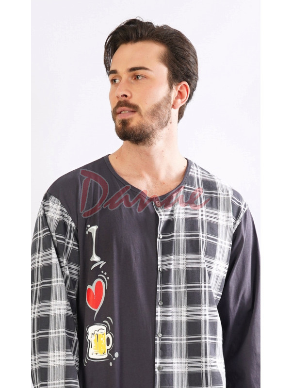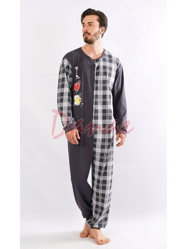 Pánský overal pro milovníka piva. Pánský overal na spaní, s dlouhým rukávem, vepředu na rozepínání, na knoflíky. Předek je rozdělen na jednobarevnou část, s půllitrem piva a srdíčkem, a károvanou část. Zadní strana overalu je celá károvaná. Rukávy jako šašek, jeden celý jednobarevný, druhý károvaný.