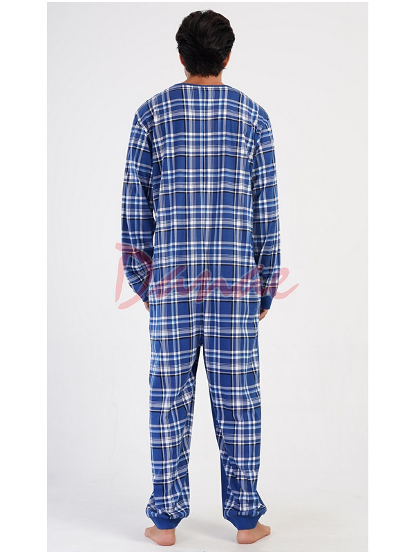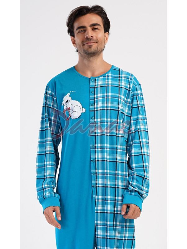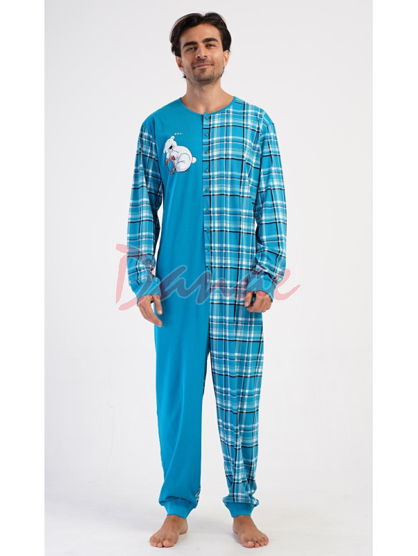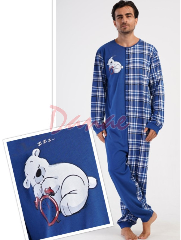 Pánský overal na spaní se spícím bílým medvědem s budíkem, na jednobarevné přední polovině overalu.