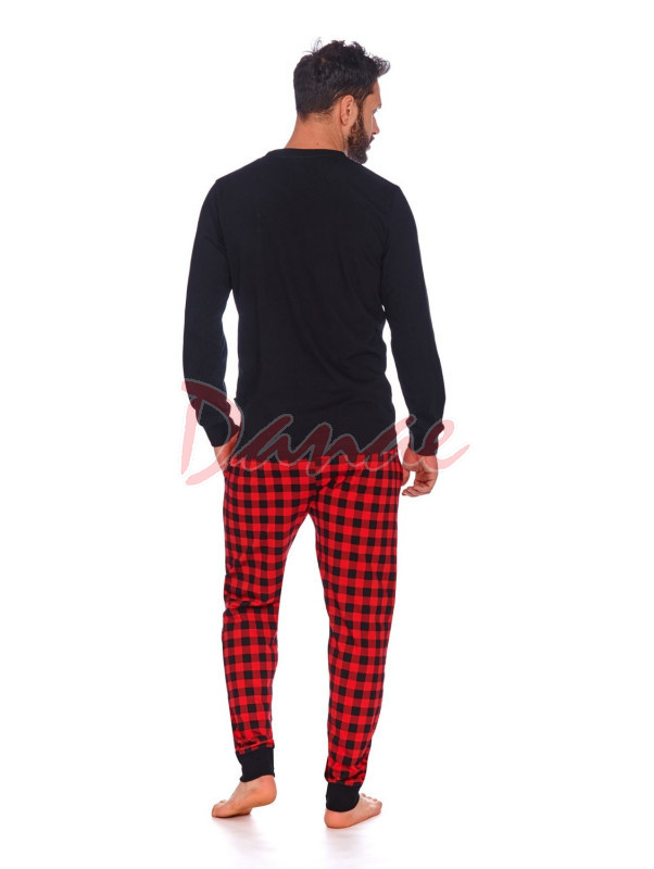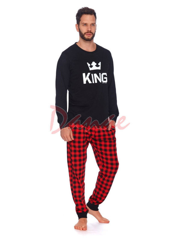 Pánské dlouhé pyžamo King, má černé tričko, s potiskem koruny a nápis: King. Tričko je s dlouhým rukávem, má okrouhlý výstřih. Kalhoty jsou černo-červeno kostkované, dlouhé, s kapsami. Rukávy i kalhoty jsou zakončeny patentem.
