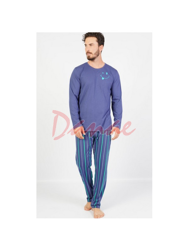 Pánské pyžamo dlouhé - Emoticon - s malým smajlíkem. Tričko (zelené nebo modré), s dlouhým rukávem, okrouhlý výstřih, má na hrudi potisk se smajlíkem. Do kompletu, dlouhé kalhoty, s pruhy, v obou soupravách modré.