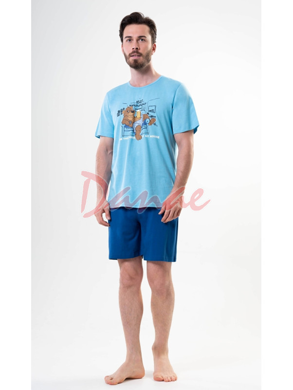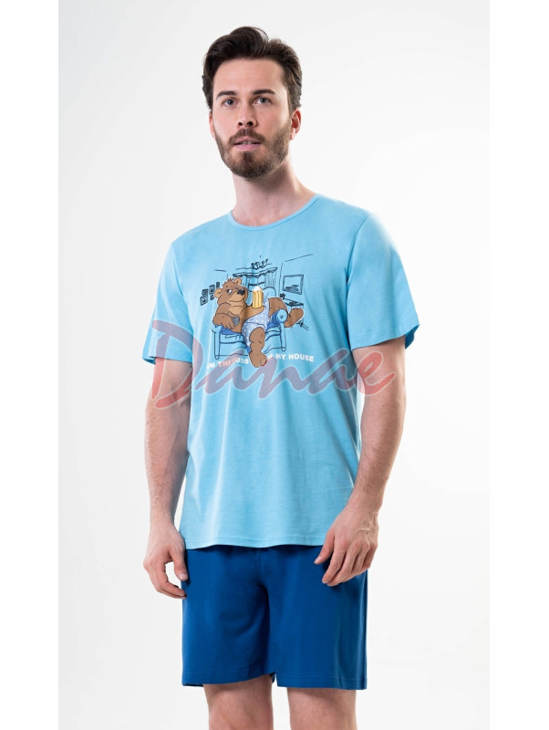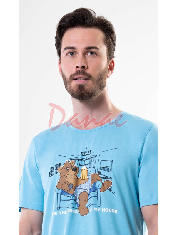 Pánské pyžamo, s veselým obrázkem - medvěd leží na pohovce, s pivem a s ovládačem od televize, nápis: I´m The Boss of my house. Bavlněné pánské pyžamo, s krátkým rukávem, okrouhlý výstřih, krátké kalhoty.