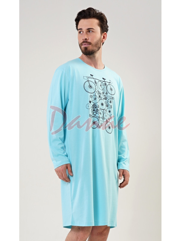 Noční košile pro cyklisty - Bicykel. Pánská noční košile, má dlouhý rukáv a okrouhlý výstřih. Vepředu je obrázek a na něm spousta bicyklů. Noční košile Bicykel, je vhodný dárek pro milovníka jízdy na kole!