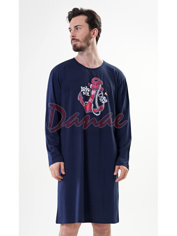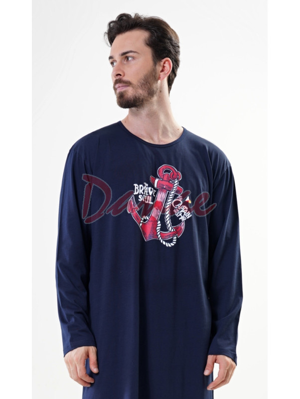 Bavlněná tmavěmodrá pánská noční košile, s dlouhým rukávem, okrouhlý výstřih, na hrudi je kotva a nápisy: