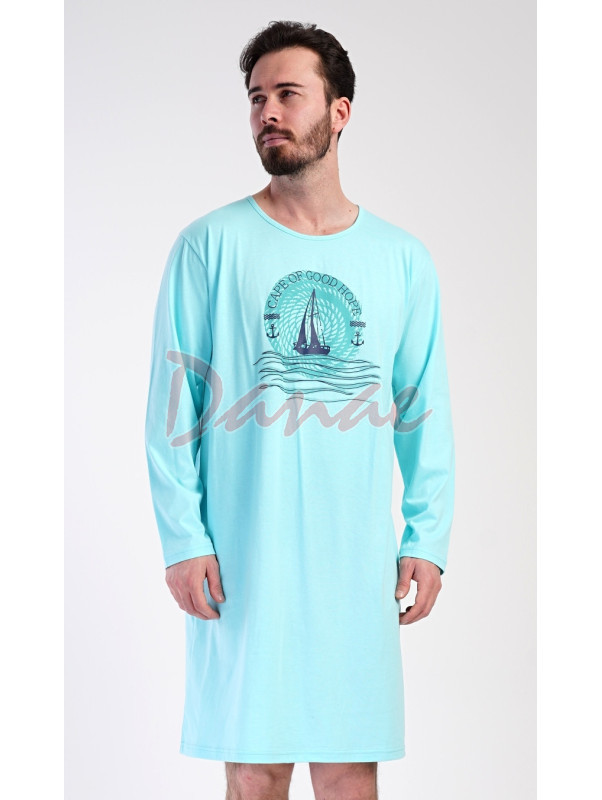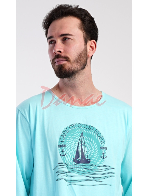 Mentolová pánská noční košile, okrouhlý výstřih, na hrudi plachetnice a nápis: " Cape of good hope".