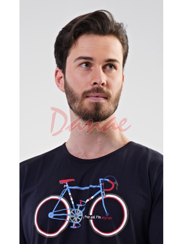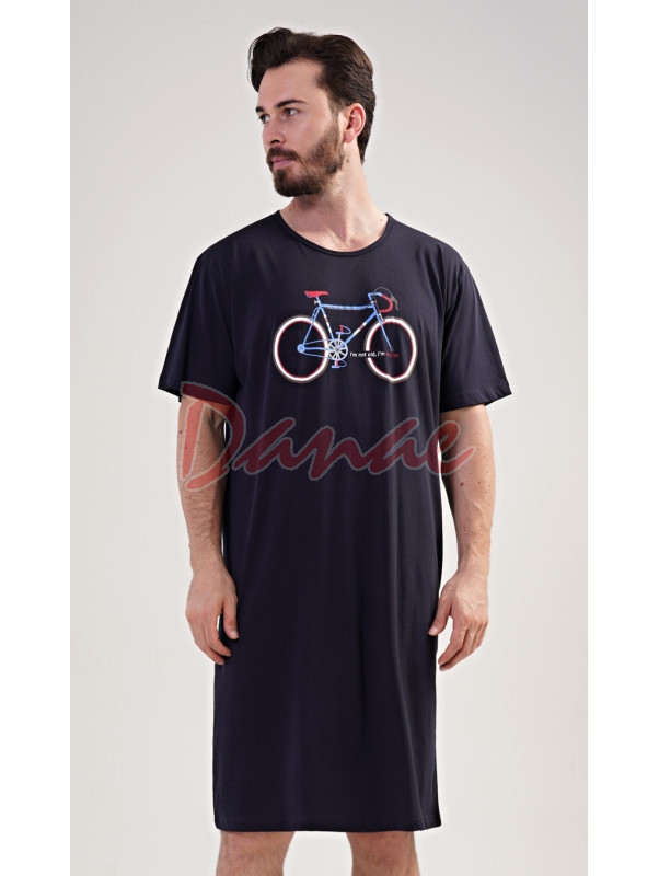 Tmavěmodrá noční košile, s krátkým rukávem, okrouhlý výstřih, má na přední části potisk - retro kolo a nápis s vtipnou narážkou: I´m not old, I´m stylish - Nejsem starý, jsem stylový, co se může vztahovat tak na kolo, jak na majitele noční košile.
