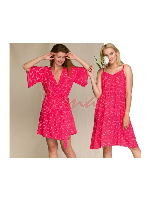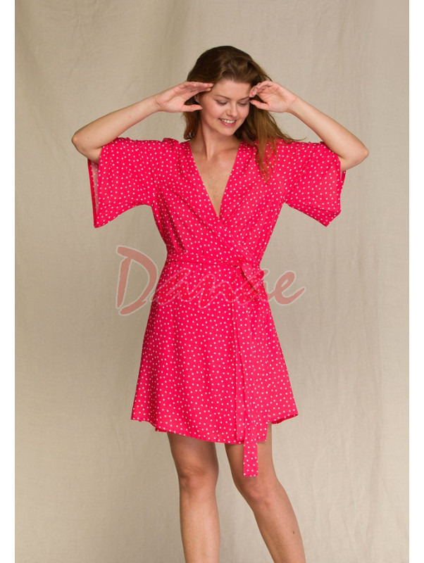 Tečkovaný župan z viskozy, s krátkým rukávem, působí na dotek hedvábným dojmem. Kimonový střih, přeložením a převázáním regulujete velikost výstřihu. Po bocích kapsy. Doporučujeme doplnit i košilku, ze stejného materiálu, kterou taky najdete v naší nabídce.